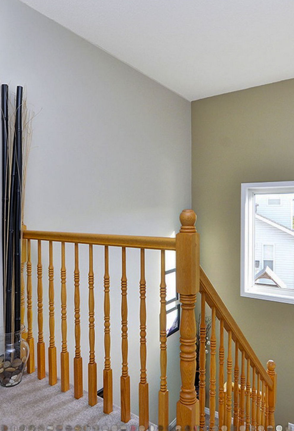 Updated staircase with painted railing and spindles in a clean black and white palette, giving the space a more modern, defined look.